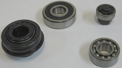 2. Cojinetes de rodadura o rodamientos, en ellos el gorrón del árbol y la superficie de rodadura del soporte están separados por elementos rodantes, de forma que con el giro del gorrón o del cojinete se genera un movimiento de rodadura y no de deslizamiento, como el caso anterior. Están constituidos por dos anillos rodantes separados entre sí por unos cuerpos, también rodantes, interpuestos entre éstos, cuya forma varía según su uso, pueden ser de diferentes formas: bolas, rodillos, cilíndricos, agujas, etc.